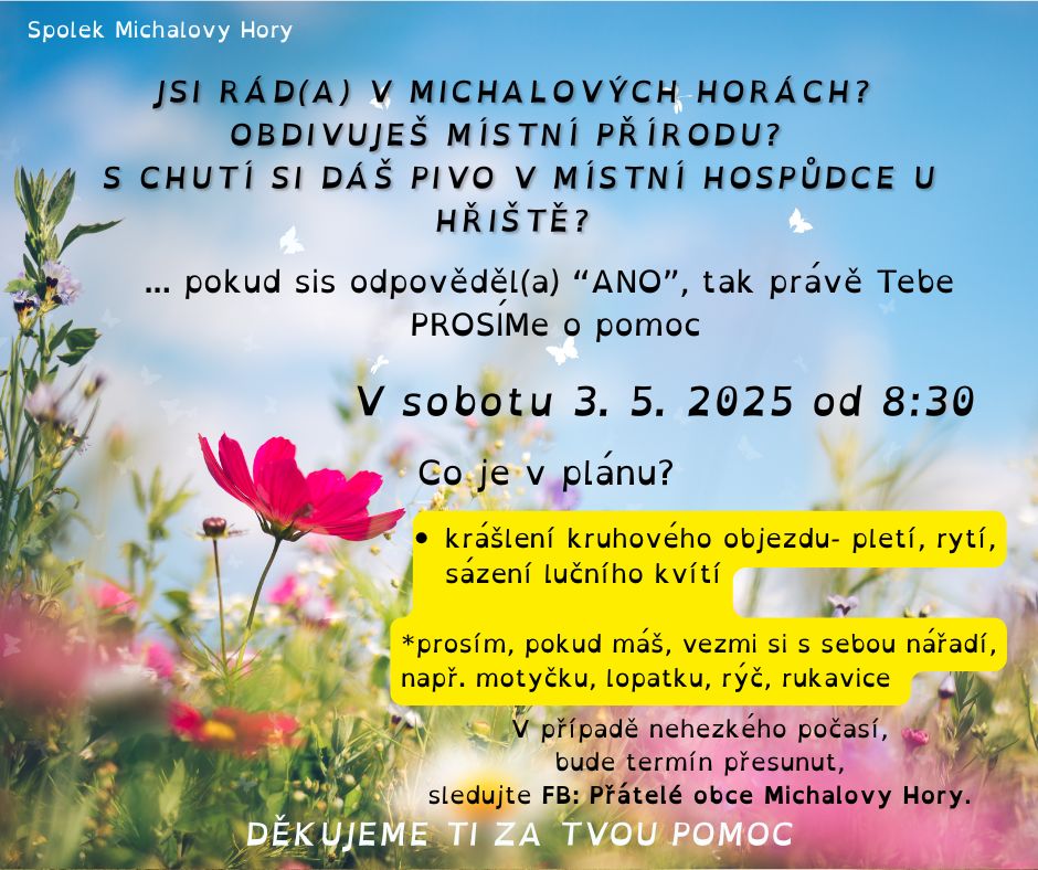 sobota 3. květen 2025 od 08:30Michalovy Hory, na návsiSoubory ke staženíPlakát (.jpg, 141.03 KB)Galerie