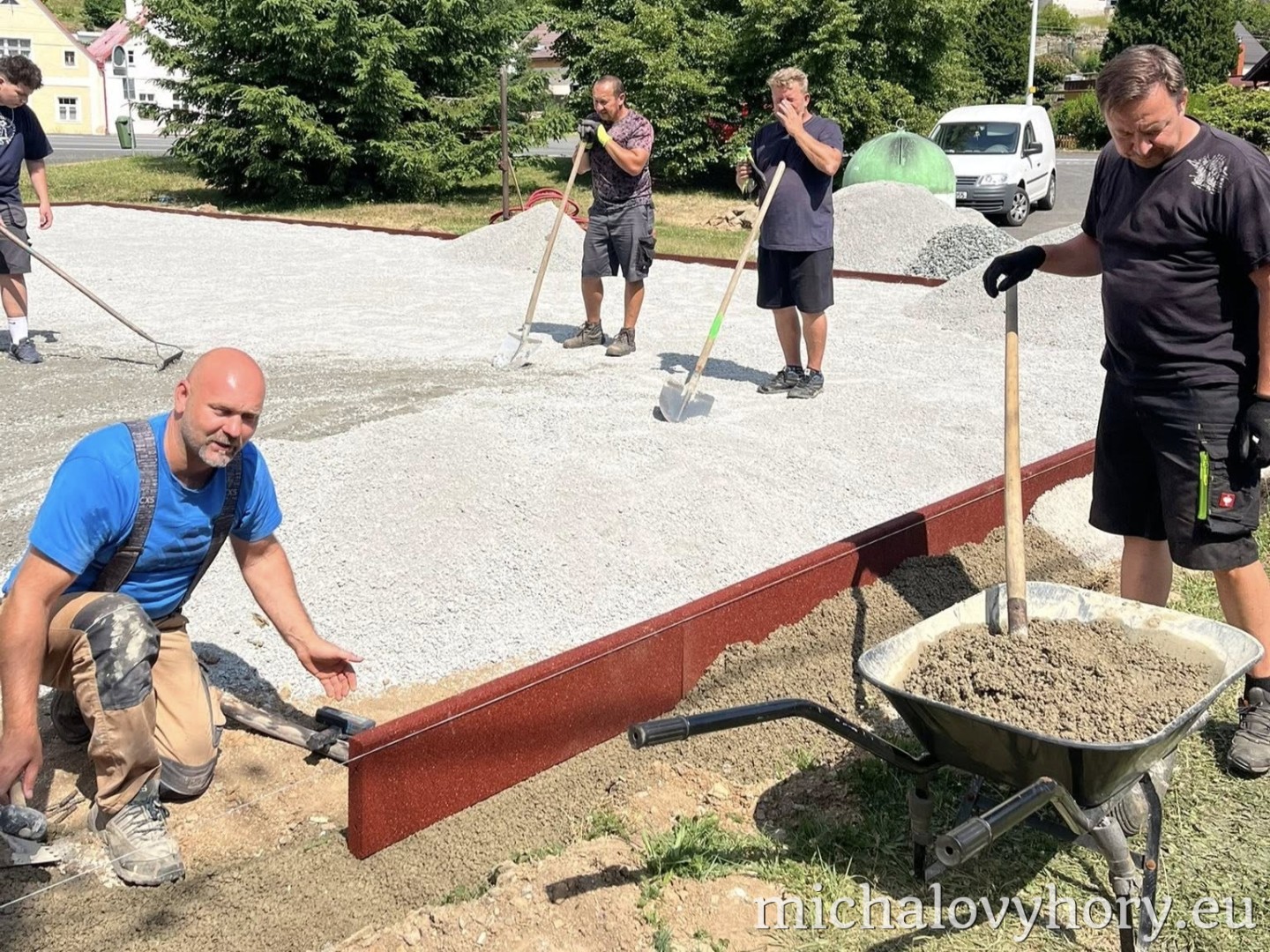 Nejprve bylo nutné prostor celkově připravit – vybagrovat starý povrch a upravit terén. Následně jsme zabetonovali obrubníky, navezli štěrk a ten pečlivě uválcovali. Poté přišla na řadu vrstva písku, kterou bylo také nutné zhutnit, aby vznikl pevný a rovný podklad pro další využití.
